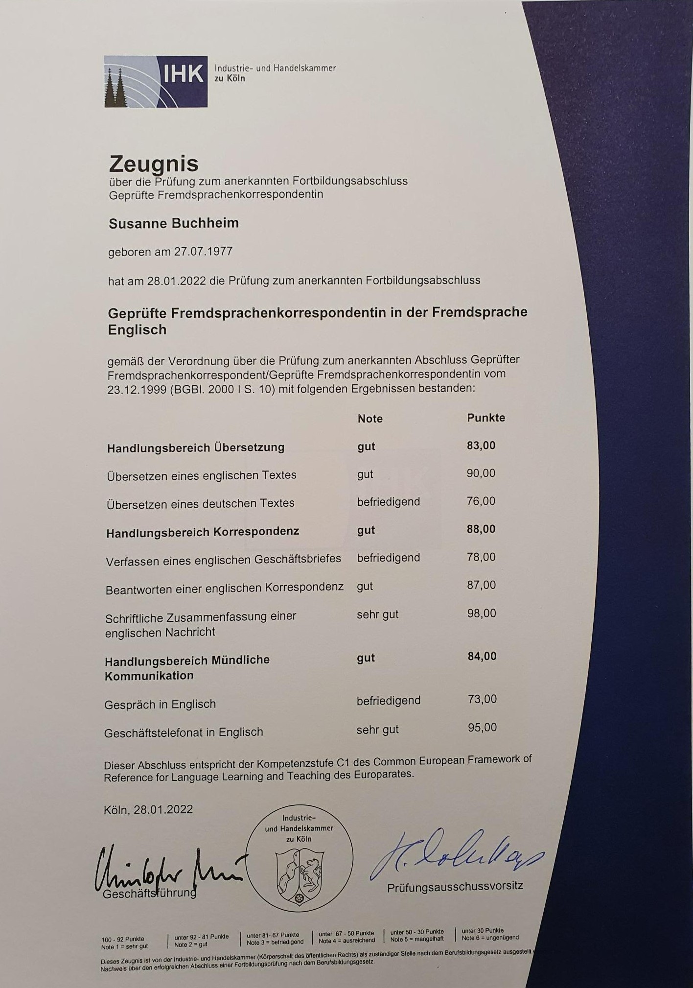 - 2022: Geprüfte Fremdsprachenkorrespondentin Englisch - Deutsch, IHK Köln