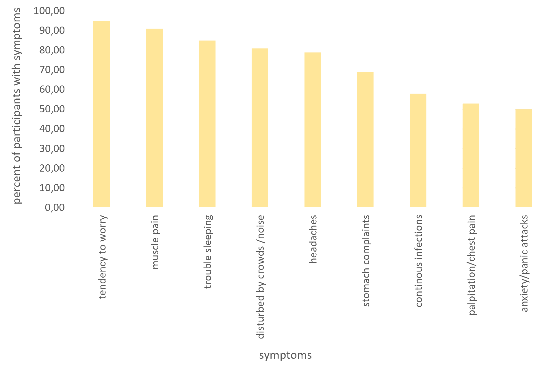 In the graph you can see that 95% of respondents have a tendency to worry. 91% suffer from muscle pain, 81% feel disturbed by noise and crowds and 50% still have anxiety or panic attacks. Of course, these are subjectively felt symptoms without a diagnosis. Anxiety disorders were also asked about once again in the diagnoses section and 16% stated that they had such a diagnosis. The discrepancy may, for example, be due to the fact that many people do not see a doctor to have the illness diagnosed.
