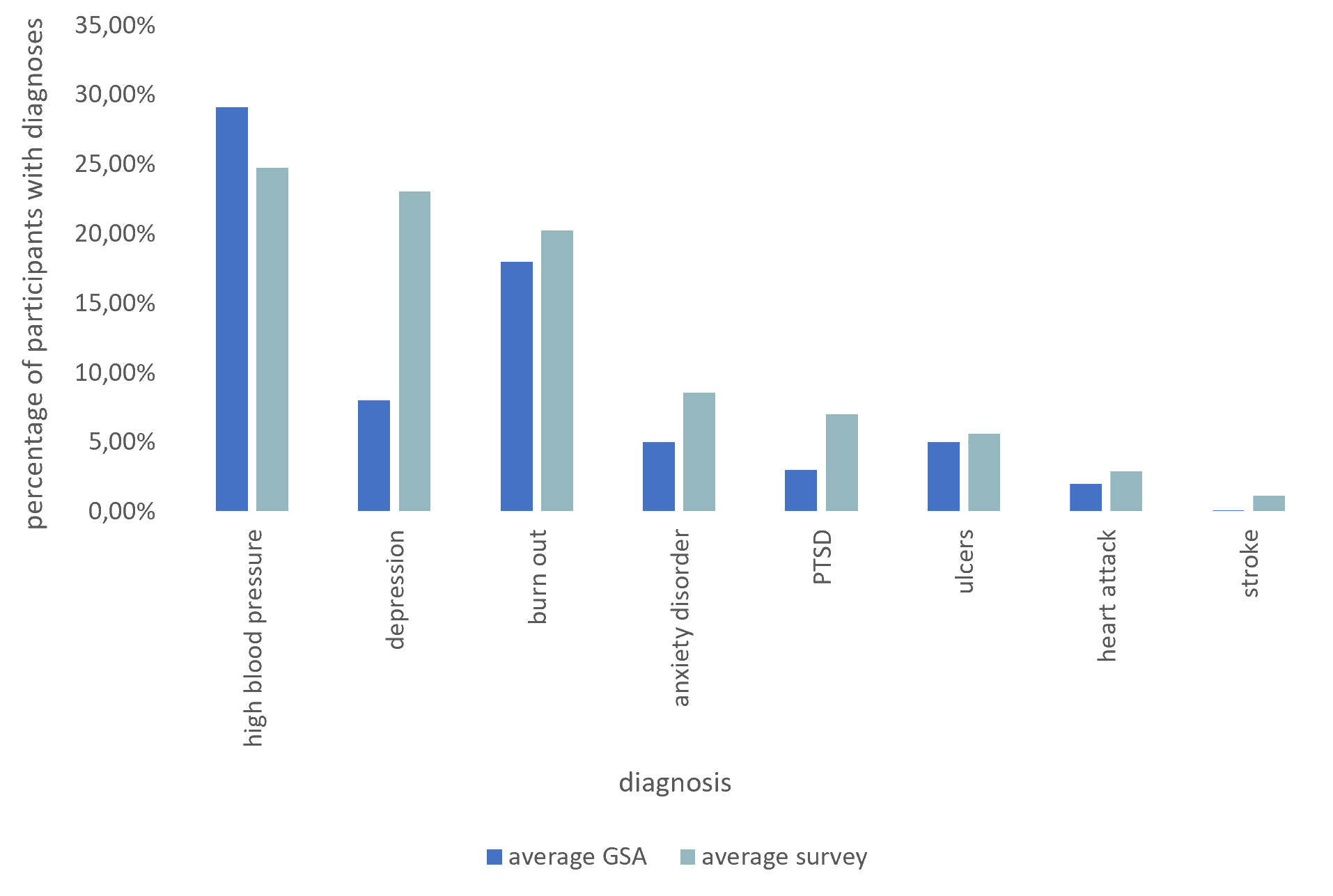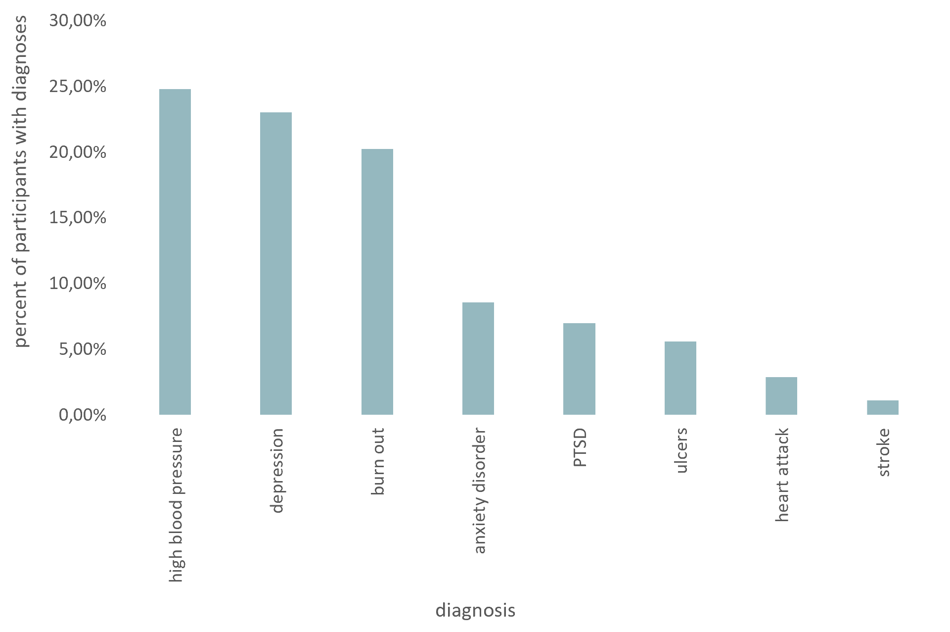 High blood pressure (282 people, 25%) was the most frequently diagnosed illness. Depression was the second most frequently diagnosed illness (263, 23%). This was followed by burn-out syndrome (233, 20 %), anxiety (186 people, 16 %), post-traumatic stress disorder (PTSD) (82.7 %), (stomach) ulcers (66, 6 %), other cardiovascular diseases (57, 5 %), heart attacks (35 people, 3 %) and strokes (15, 1 %).