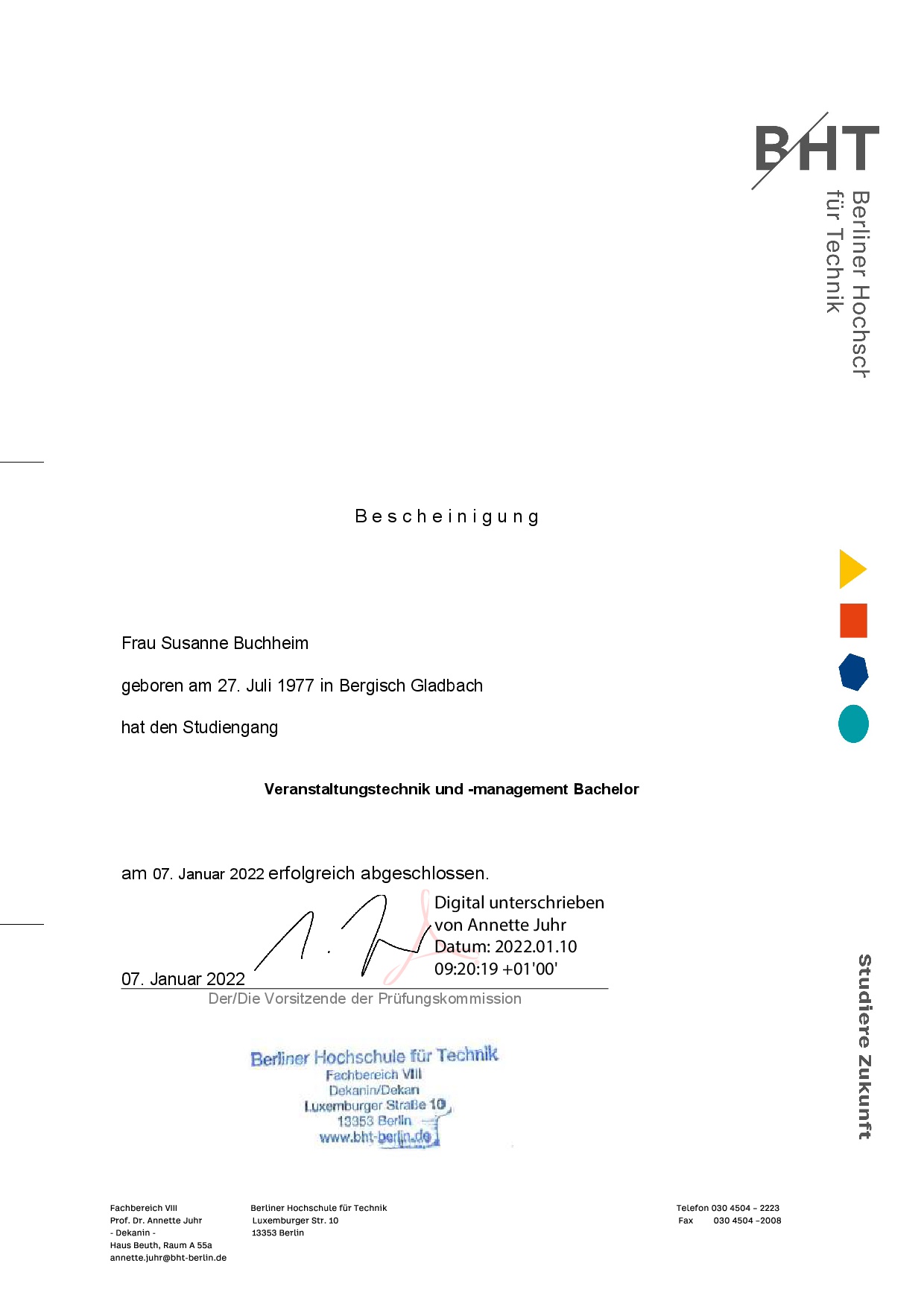 - 2021: Bachelor of engineering in Veranstaltungstechnik und -management, BHT Berlin